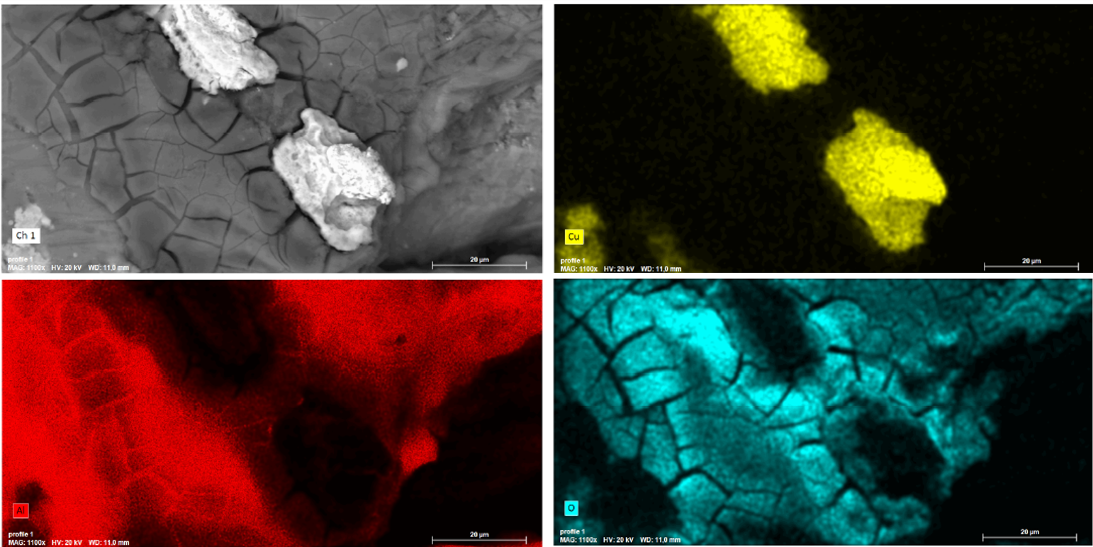 Energy Dispersive X-ray Spectroscopy (EDX) is an analysis technique used in conjunction with Scanning Electron Microscopy (SEM). EDX offers elemental identification and quantitative compositional information of features down to ~1 µm in size. EDX can be performed as point or area analysis, line scans and mapping, i.e. chemical maps showing the distribution of selected elements over the imaged surface section.